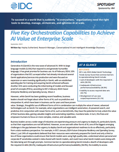 Five key orchestration capabilities can help organizations achieve this goal: data readiness, skill gap mitigation, infrastructure support, use case alignment, and rapid deployment.