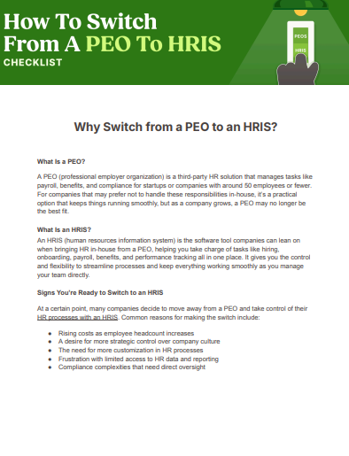 Whether you’re ready to switch from a PEO to HR software, or wondering what switching solutions would even look like, download our FREE checklist for a simple, step-by-step guide to making the change. Discover how easy upgrading your HR strategy can be!