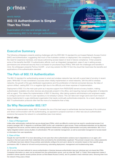The white paper discusses the challenges of implementing 802.1X authentication, including complex deployment requiring support infrastructure at every location. It presents Portnox CLEAR as a solution that delivers 802.1X authentication as a cloud service, addressing these challenges by eliminating the need for on-premise hardware or network infrastructure. Portnox CLEAR automates policy enforcement using device risk scores and simplifies 802.1X deployment without compromising security, making it suitable for cloud-focused and geographically distributed enterprises.