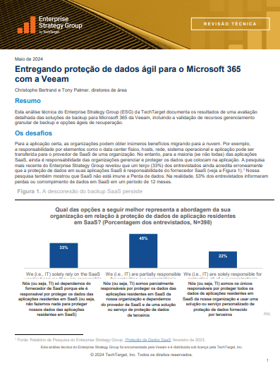 Leia análise técnica aprofundada da ESG sobre as soluções de backup para Microsoft 365 da Veeam, destacando o gerenciamento validado de backups granulares e as opções ágeis de recuperação.