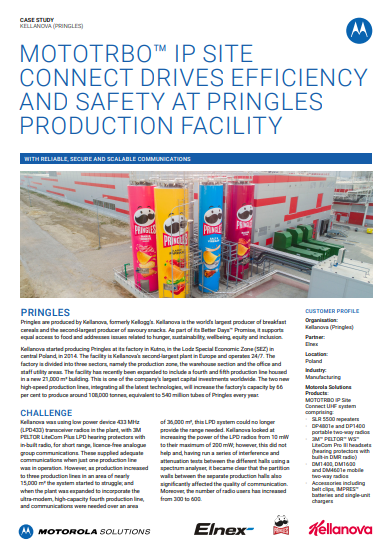 Kellanova (Pringles) faced increasing communication challenges as their production facility in Poland expanded. Their previous system couldn’t support the larger workforce and new production lines. Partnering with Elnex, they implemented the MOTOTRBO IP Site Connect system, which provided seamless, secure, and scalable communication across their facility. This upgrade enhanced worker safety, productivity, and operational efficiency, ensuring continuous connectivity even in high-noise areas. With a future-proof solution in place, Kellanova now operates with greater reliability and efficiency.